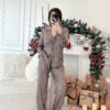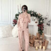 Mẫu pijamas lụa dáng dài với những họa tiết mang đậm hơi thở Giáng sinh tưng bừng kết hợp với bảng màu dịu nhẹ, nền nã tạo cho nàng vẻ ngoài thanh lịch và quý phái.